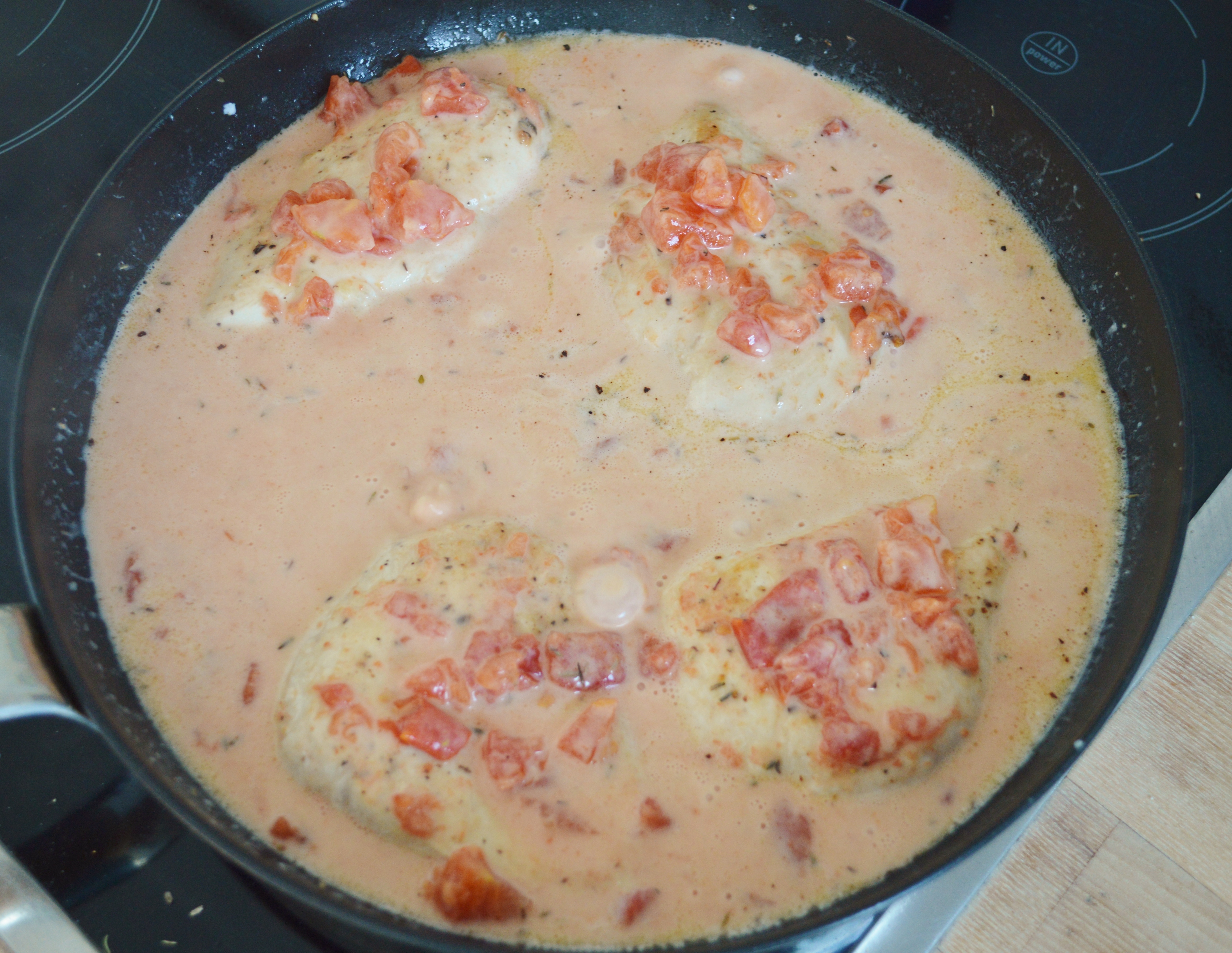 Don’t you know that feeling when you’re just hungry after work and don’t know what to make for dinner? It’s tempting to just order a pizza or other take-out, but really you’d like something good? Well, look no further. This is a recipe my mom once found somewhere and adapted it over the years, and it’s sooooo delicious! I’ve made this for guests, too, and people love it. Plus, it’s super simple to make! Just throw the ingredients together and pop it in the oven. It’s pan-fried chicken breasts in a creamy vermouth-tomato-sauce with thyme, but that was a bit too long to put in the title. Served over fresh tagliatelle, maybe with a green side salad – perfection.